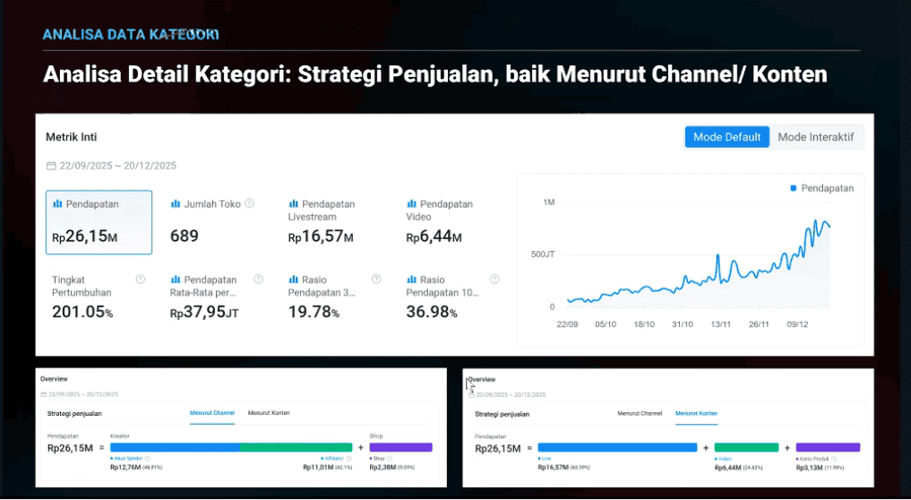 - Analisis sumber pendapatan (live, video, shop) serta video berpenjualan tinggi.