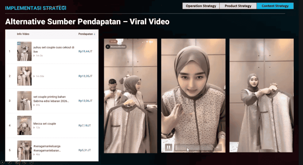Pilih beberapa video dengan penjualan terbaik, kemudian amati polanya. Dalam studi kasus, hampir semua video viral yang mendorong penjualan adalah potongan dari live stream, biasanya menonjolkan detail bahan, ukuran, kenyamanan, hingga urgensi pre‑order.