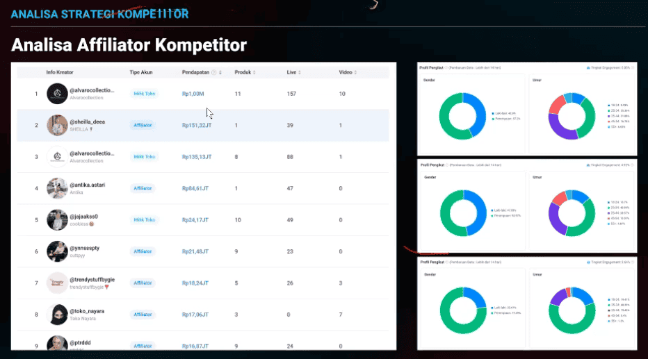 Langkah berikutnya adalah membedah siapa saja kreator atau afiliasi yang paling efektif menjual produk tersebut, serta seperti apa karakter pengikut mereka. Dari analisis terhadap toko contoh, ditemukan bahwa meskipun akun toko sendiri tetap dominan, ada beberapa kreator afiliasi yang penjualannya sangat kuat.