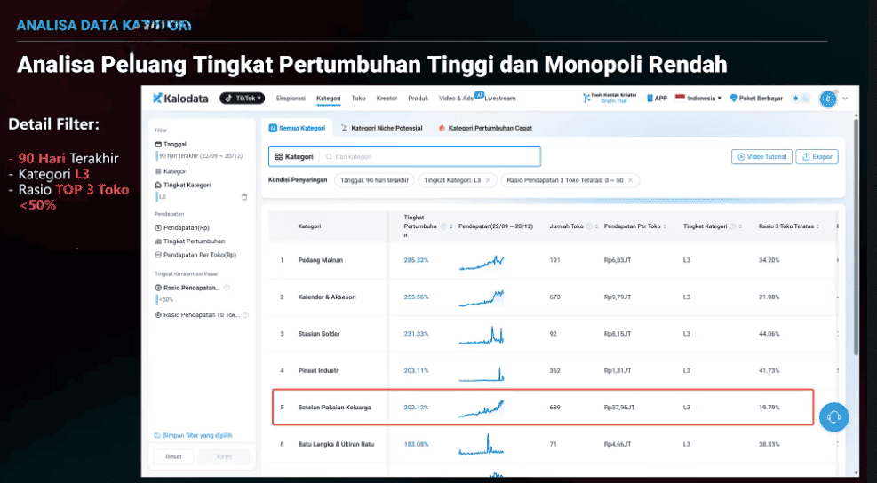 Contoh kasus yang dibahas adalah kategori “Setelan Pakaian Keluarga” di bawah “Fashion Muslim”. Dalam periode 90 hari, kategori ini menunjukkan pendapatan yang besar, didominasi oleh live stream, dan memiliki struktur kompetisi yang belum terlalu terkonsentrasi pada sedikit toko.